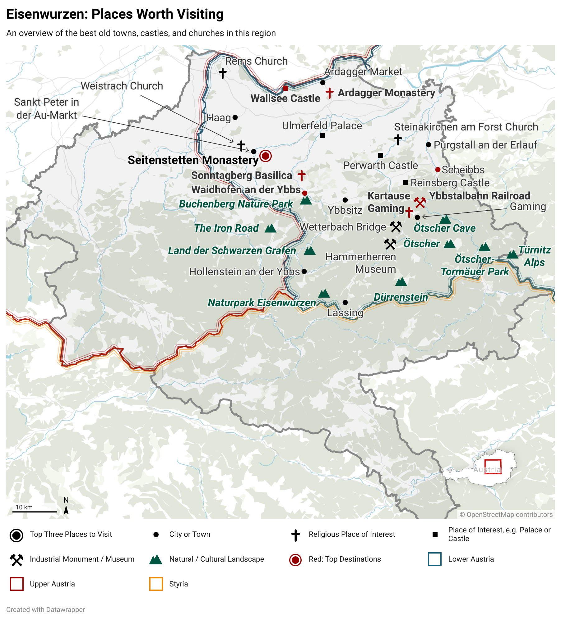 Travelers to Eisenwurzen can explore imposing castles, baroque churches, and open-air museums that reveal the district’s industrial roots. The region’s forests and mountains are ideal for hiking, cycling, and winter sports, while the crystal-clear lakes and rivers invite fishing and boating. Key attractions include the Eisenstraße (“Iron Road”), a scenic route linking historic ironworks and forges, and the picturesque town of Steyr, where medieval architecture meets industrial history.